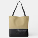 This lovely fashion forward tote bag shows the word "Bridesmaid" in white text colour over black with the upper tote bag in custom Matte Gold. Has plenty of room for personalised text. Graphics and text are on both sides of this tote bag. Black handle. Customise further or buy as shown.