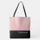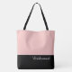 This lovely fashion forward tote bag shows the word "Bridesmaid" in white text colour over black with the upper tote bag in custom Dusty Rose Pink. Has plenty of room for personalised text. Graphics and text are on both sides of this tote bag. Black handle. Customise further or buy as shown.