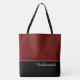 This lovely fashion forward tote bag shows the word "Bridesmaid" in white text colour over black with the upper tote bag in custom Merlot. Has plenty of room for personalised text. Graphics and text are on both sides of this tote bag. Black handle. Customise further or buy as shown.