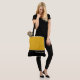 This lovely fashion forward tote bag shows the word "Bridesmaid" in white text colour over black with the upper tote bag in custom Mellow Yellow. Has plenty of room for personalised text. Graphics and text are on both sides of this tote bag. Black handle. Customise further or buy as shown.