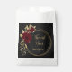 Chic and elegant wedding favour bag featuring beautiful burgundy flowers and some elegant gold leaves on black background.
