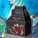 Chic and elegant wedding favour box featuring beautiful burgundy flowers and some elegant gold leaves.