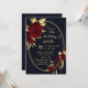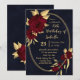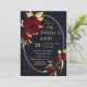 Chic and elegant navy blue birthday party invitation featuring beautiful burgundy flowers and some elegant gold leaves botanical geometric frame.