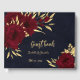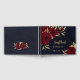 Chic and elegant navy blue wedding guest book featuring beautiful burgundy flowers and some elegant gold leaves .