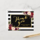 Elegant burgundy and floral watercolor and faux gold foil script with black and white stripes design Chic Vintage Wedding Thank You Postcard. Elke Clarke © Other colours available at www.zazzle.com/monogramgallery. A simple, yet versatile, hand lettered script "Thank You" for weddings or other special occasions such as rehearsal dinners, couple's showers, wedding anniversary celebrations. Gold foil is a printed photo effect.