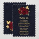 Chic and elegant navy blue seating chart table number card featuring beautiful burgundy flowers and some elegant gold leaves.