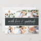 Elegant flat thank you cards feature six of your favourite wedding photos in a collage layout with a charcoal off-black stripe running through the centre. "With love and gratitude" or your custom message appears in white calligraphy script, with your names and wedding day beneath. Personalise the back with a pre-printed message, or delete the sample text if you prefer a handwritten note.