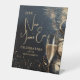Stylish New Year's Eve party welcome pedestal sign features a champagne glass, clocks, confetti and fireworks on a midnight blue background with your party details in chic lettering. MATCHING items in our collection.