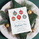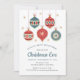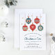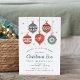 This elegant holidays design features festive Christmas ornaments in red and blue surrounded by falling golden snowflakes. Customise with your Christmas Eve dinner invitation details aligned to the centre, embellished with "Christmas Eve" in chic blue calligraphy script. On the invitations reverse is solid blue.