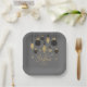 Black and gold Christmas tree ornaments and snowflakes on a grey background highlight these square holiday party paper plates with your name and Merry Christmas in chic lettering. Perfect for your personal or business holiday parties. MATCHING items in our collection.