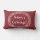 A festive Lumbar Pillow or Cushion with a Christmas wreath of holly, ivy, poinsettias, fir cones and sprigs of fir tree, This hand-drawn Christmas wreath is in White on a Deep Red background, with 'Season's Greetings' in decorative lettering, also in White.