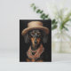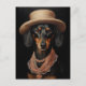 Portrait from a super elegant dachshund with a fancy cream hat, pink scarf and pearls