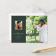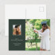 This graduation announcement features a stylish dark green background with a large photo and a smaller photograph. Details include the graduate's degree, major, school name, and graduating year with the graduate's name highlighted in a "signature" style handwritten font. This postcard graduation announcement is setup for easy mailing.