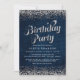 These chic denim & diamonds birthday party invitations feature the words “Birthday Party” in a fun script typeface with little confetti gems at the top and bottom on a denim background. Design by The Spotted Olive™.