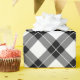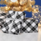 Sophisticated wrapping paper features black, white, and grey diamonds in a bold, buffalo plaid with thin white lines through the black and grey diamonds.