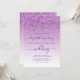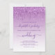 A chic, modern design featuring a purple ombre background with a top border of purple glitter drips. The word "wedding" and the couple's first names appear in lowercase calligraphy script with decorative swashes at the beginning and end, with the remaining text in sans serif font. The purple ombre background and glitter drip border are repeated on the reverse. (To keep the swashes, replace only the letters, leaving the symbols in place.)