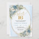 Celebrate a milestone moment with this elegant Sweet Sixteen invitation, featuring a refined watercolor design of dusty blue florals blended with soft white flowers and fresh eucalyptus greenery. Framed by a shimmering gold glitter border and paired with graceful script lettering, this invitation sets a sophisticated tone for a truly unforgettable Sweet Sixteen, Sweet 16th, or 16th birthday celebration.