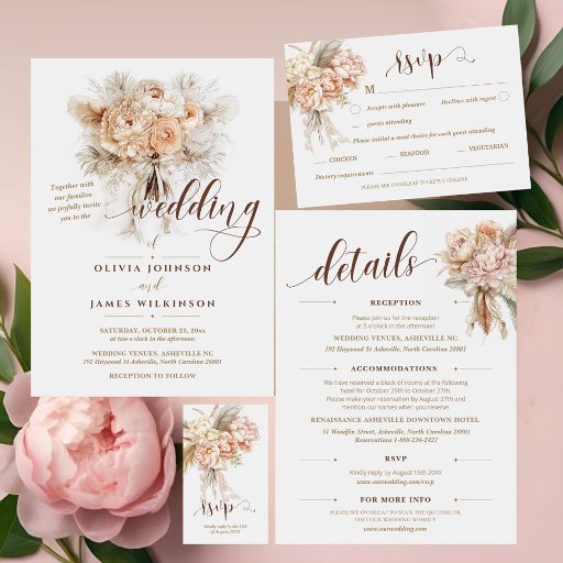 Customise this "Chic Elegant Boho Style Floral Script Wedding Foil Invitation", featuring a Boho Coquette-style watercolor drawing of a bouquet of creamy peonies, feathers, and lace, accented with a graceful bow and elegant handwritten script, with rose gold foil, it exudes timeless elegance and romance. Please get in touch with the store designer for further customisation if needed.