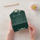 All in one emerald green postponed wedding invitation featuring botanical greenery rustic leaves falling across a gold arch enclosing elegant typography. The invitation includes a perforated RSVP card with your wedding website QR code. Designed by Thisisnotme©