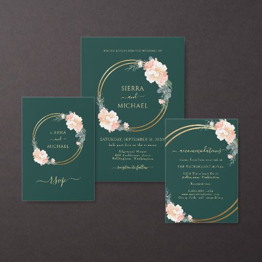 Chic Emerald Green Gold Rings Blush Floral Wedding Invitation
