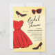Chic bridal shower invitation featuring fashionable red polka dot dress, red sunglasses and a pair of dark heels against a modern light orange geometric background. Invitation has a black and white polka dot back side.