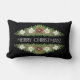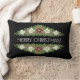 A chic Christmas Lumbar Pillow or Cushion, with swags of Christmas Roses, Holly and Ivy on a black background, with Merry Christmas in stylish, modern lettering, in white. From a hand-painted design by Judy Adamson.