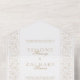 Chic bands of elegant formal ecru scrollwork in a dimensional sculpted style form a border on either side of this classic design. The top flap features a complementary scrollwork ornament with space for your initials. This all-in-one format features a bonus tearaway RSVP card.