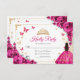 Fuchsia pink, gold and white Quinceanera RSVP reply card. Features brunette girl in ball gown dress, script font, gold butterflies, hot pink roses and tiara. Perfect for an elegant princess style glam celebration. Personalize with your own details.