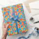 A roll of very stylish Wrapping Paper, with a pattern pattern of red, orange, yellow flowers on a bright turquoise background, from a handpainted paper collage by Judy Adamson.