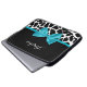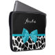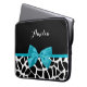 A chic black and white giraffe print 15'' laptop sleeve with a trendy aqua blue ribbon tied into a girly bow. Personalise this cute animal print design by adding your name. Flat printed image, not actual bow.