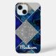 Chic girly faux Glitter silver blue geometric squares iPhone 15 Case. To make it extra special, it is also monogrammed and personalised with name or initials or any text you like, click the "customise further" link and use the design tool to modify the design if you like.