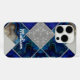 Elegant girly faux Glitter silver blue geometric squares iPhone 16 Case. To make it extra special, it is also monogrammed and personalised with name or initials or any text you like.
