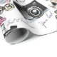 This modern girly design features an illustration of fashion necessities such as lipstick, perfume and heels with iconic Paris fashion icons the camera and Eiffel Tower.