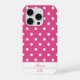 Add a touch of playful charm to your phone with this chic iPhone 15 Pro case featuring a pink and white white polka dot pattern. Designed for those who love a fun and feminine style, this case is also customisable to make it uniquely yours. Personalise it with your first name in a beautiful script, and add your initials in a stylish monogram for an extra dose of sophistication. Also makes a great gift for birthdays and all occasions.