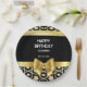 This elegant birthday paper plate design features a gold Egypt geometric pattern with a gold bow ribbon on a black background.