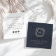 Promote your jewellery design business with these elegant square business cards in rich navy blue with golden accents. Design features an art deco style faceted gemstone illustration in faux gold foil, with a single initial monogram inside and two lines of custom text beneath. Add your jeweller business contact details to the reverse side, along with your social media username. To reveal additional social media icon options, open the design tool.