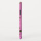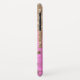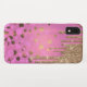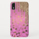 Chic iPhone 6.1 case done in a pink foil look with pink and gold dots and graphics of faux gold glitter paint dripping down from the top. Customise this glam phone case to add your own text.