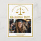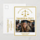 This chic gold custom law school graduation party invitation postcard features classy typography for a class of 2024 graduate above your student photo. Customise with your graduating year under the scales of justice symbol and photograph for a great personalised lawyer or attorney postcard invite.