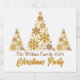 A chic gold script Christmas party champagne bottle labels with your family name under beautiful trees made of golden snowflakes above Merry Christmas. Trendy holiday favours with an artistic design.