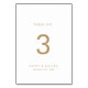 This chic gold typography table number is perfect for a modern wedding. The simple design features classic minimalist gold and white typography with a rustic boho feel. Customisable in any colour. Keep the design minimal and elegant, as is, or personalise it by adding your own graphics and artwork. The card prints on the front and back (double-sided). Items are printed exactly as they appear on your screen when you add to cart, so personalise and add each table number that you need to your cart individually.