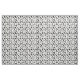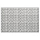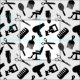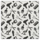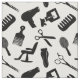 Fabric with a black and white pattern of the silhouettes of different hairdresser tools, like scissors, combs, hair dryers, etc.
