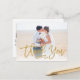 Stylish wedding thank you post card template featuring a photo on the front and back, "Thank You" in a modern gold script font, and custom text thank you message.