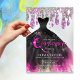 Elegant black hot pink dress crystal drips Quinceanera Acrylic transparent Invitations with faux glitter and rhinestones design and a pretty black dress with hot pink glittery patterned accents. To make it extra special you will personalise it with your own information with beautiful monogram fonts.
