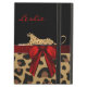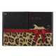 Stylish iPad Air case, with built in stand and graphics of a spotted brown and black coloured jaguar fur pattern, on the bottom, with a solid black on the top, of the case. Graphics of a red satin looking ribbon runs across the middle and has a pretty red bow, on the right side. Graphics of a wild spotted big cat appears to lay across the top of the ribbon. Personalise the red text. Makes an excellent gift idea.