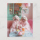 Two happy anthropomorphic Labradoodle dogs relax in a stylish, pastel pink lounge, dressed in fluffy pink coats. The cosy, aesthetic setting is complemented by lush plants, elegant decor, and a refreshing drink on a marble table.