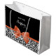 Personalise by adding the name of any girly girl to this chic black and white leopard print large size gift bag with an elegant burnt orange ribbon tied into a sophisticated bow. This stylish animal print design is a flat printed image, and does not contain actual ribbon.