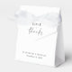 A chic minimalist wedding favour box featuring "Love + Thanks" in a modern script and elegant serif typography, your names and wedding date.