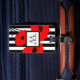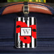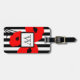 CHIC LUGGAGE TAG_MOD 01 RED AND BLACK FLORAL POPPIES ON BLACK AND WHITE STRIPES. WHITE CENTER WITH AND BLACK MONOGRAM. BLACK BACK WITH WHITE INFORMATION TEXT.