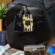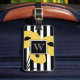 CHIC LUGGAGE TAG_MOD "PRIMROSE YELLOW" AND BLACK FLORAL POPPIES ON BLACK AND WHITE STRIPES. BLACK CENTER WITH AND WHITE MONOGRAM. BLACK BACK WITH WHITE INFORMATION TEXT.