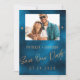 Modern trendy wedding Save Our Date copper gold glitter typography handwriting script and your custom photo over a dark blue washed watercolor background making a luxury glam elegant wedding save the date announcement card. +++++++++++++ Easy to personalise with your favourite photo and details on both sides!